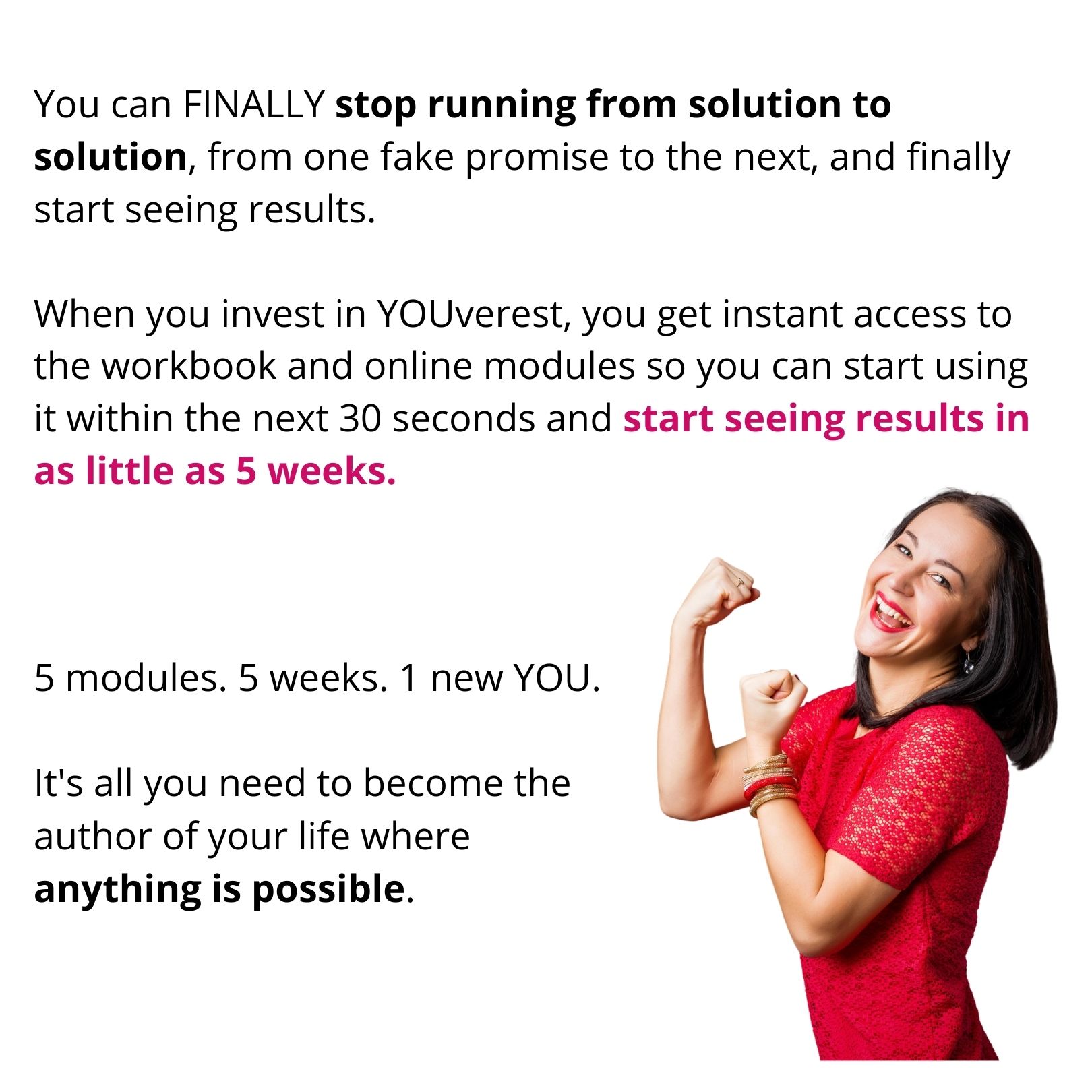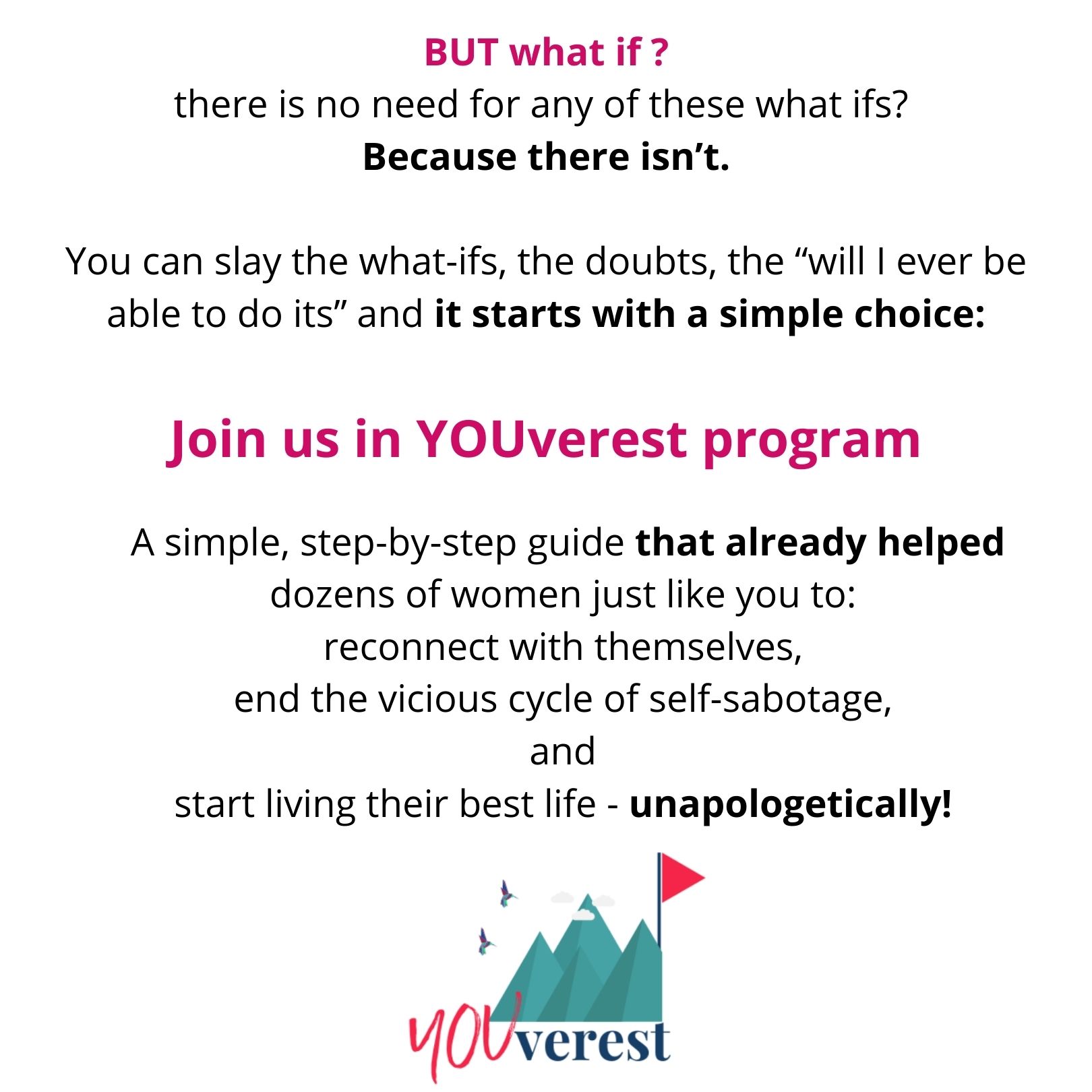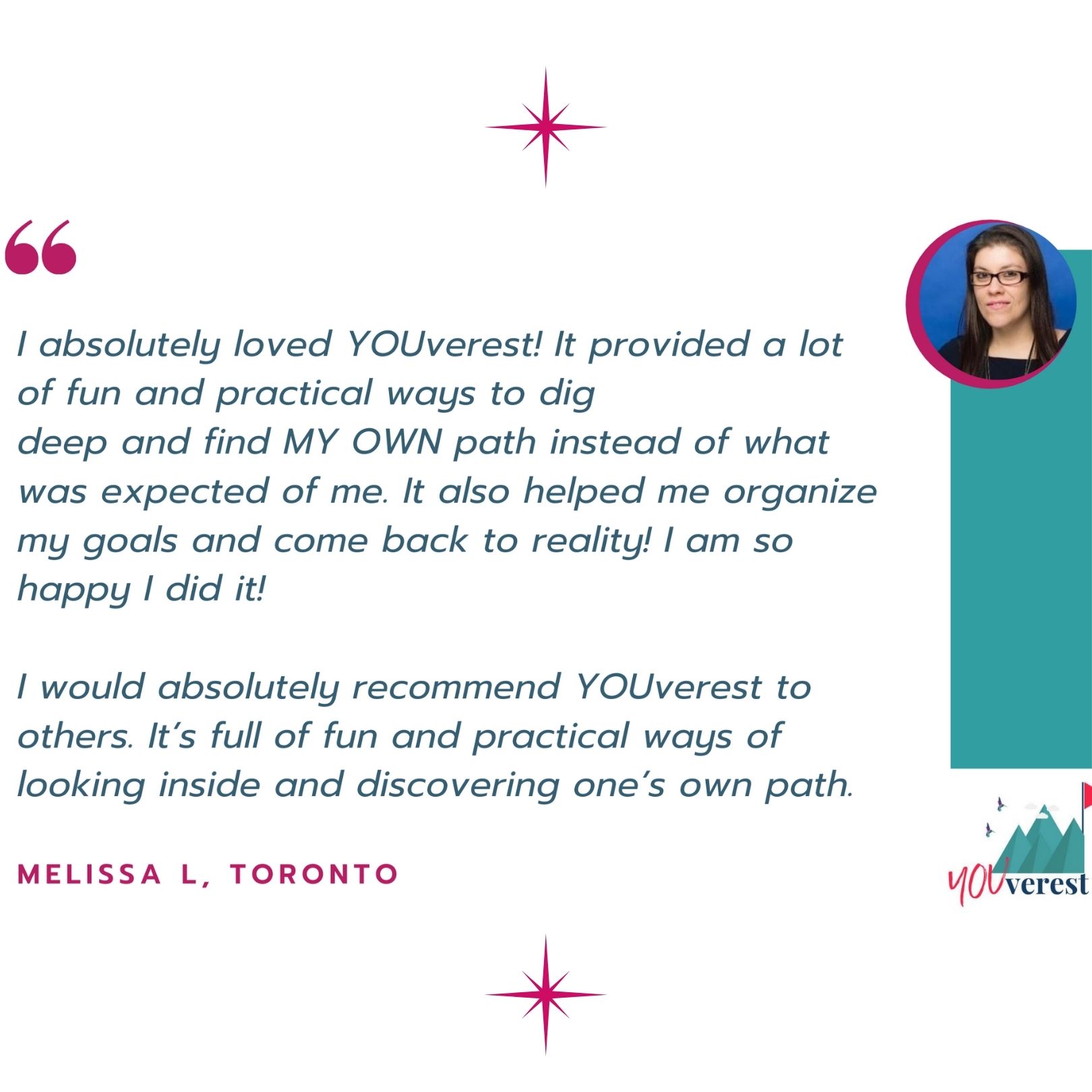 Because of YOUverest I am more conscious of how I am thinking and feeling in the present moment. The program helped me reconnect with my WHY. I love that encourages introspection self-discovery through fun and insightful exercises.